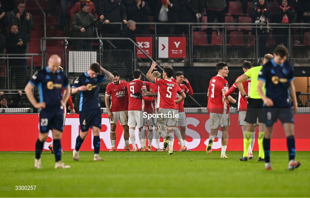 27 November 2025; AZ Alkmaar players celebrate their side's second goal scored by Isak Jenson, hidden, during the UEFA Conference League 2025/26 league phase match between AZ Alkmaar and Shelbourne at AFAS Stadion in Alkmaar, Netherlands. Photo by Ben McShane/Sportsfile