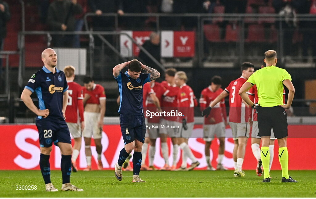 27 November 2025; Kameron Ledwidge of Shelbourne reacts after his side conede their second goal during the UEFA Conference League 2025/26 league phase match between AZ Alkmaar and Shelbourne at AFAS Stadion in Alkmaar, Netherlands. Photo by Ben McShane/Sportsfile