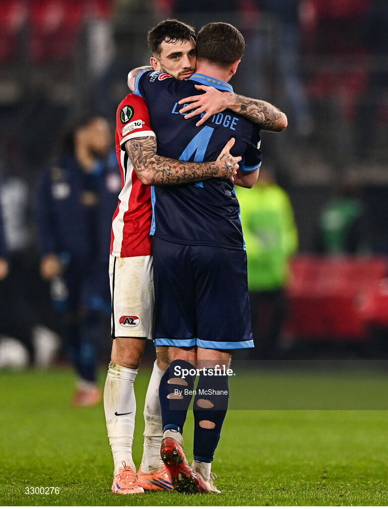 27 November 2025; Troy Parrott of AZ Alkmaar and Kameron Ledwidge of Shelbourne after the UEFA Conference League 2025/26 league phase match between AZ Alkmaar and Shelbourne at AFAS Stadion in Alkmaar, Netherlands. Photo by Ben McShane/Sportsfile