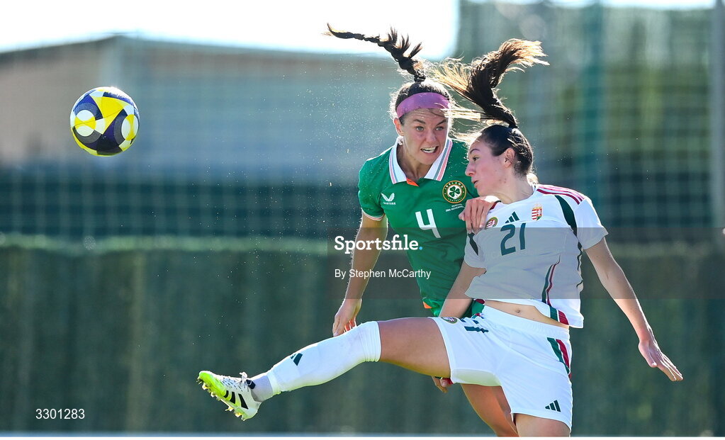29 November 2025; Caitlin Hayes of Republic of Ireland and Fanni Nagy of Hungary contest a header during the women's international friendly match between Republic of Ireland and Hungary at Marbella Football Centre in Marbella, Spain. Photo by Stephen McCarthy/Sportsfile