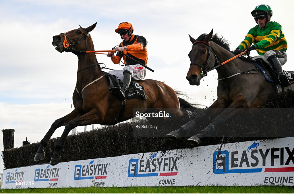 29 November 2025; True Testimony, left, with Joey Dunne up, jumps the last on their way to winning the Race And Stay Irish EBF Mares Handicap Steeplechase, from second place Uhavemeinstitches, right, with Simon Torrens up, during day one of the Fairyhouse Winter Festival at Fairyhouse Racecourse in Meath. Photo by Seb Daly/Sportsfile