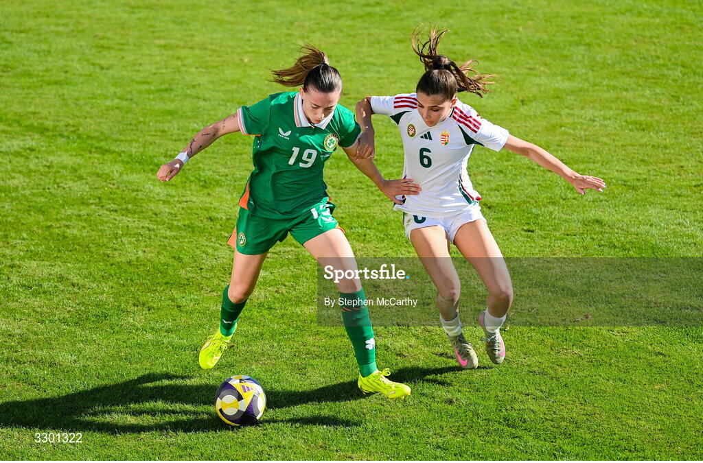 29 November 2025; Abbie Larkin of Republic of Ireland in action against Borbala Vincze of Hungary during the women's international friendly match between Republic of Ireland and Hungary at Marbella Football Centre in Marbella, Spain. Photo by Stephen McCarthy/Sportsfile