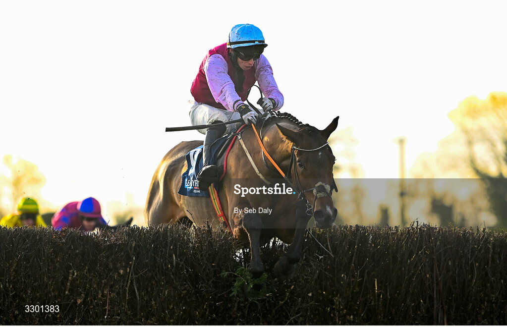29 November 2025; Drumgill, with Michael Kenneally up, jumps the last on their way to winning the EASYFIX Equine Handicap Steeplechase during day one of the Fairyhouse Winter Festival at Fairyhouse Racecourse in Meath. Photo by Seb Daly/Sportsfile