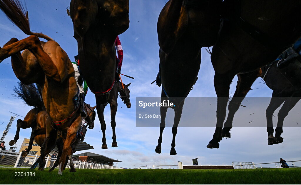 29 November 2025; Runners and riders jump the first during the EASYFIX Equine Handicap Steeplechase on day one of the Fairyhouse Winter Festival at Fairyhouse Racecourse in Meath. Photo by Seb Daly/Sportsfile