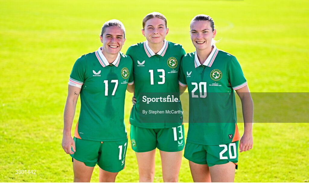 29 November 2025; Republic of Ireland players, from left, Jamie Finn, Hayley Nolan and Saoirse Noonan after the women's international friendly match between Republic of Ireland and Hungary at Marbella Football Centre in Marbella, Spain. Photo by Stephen McCarthy/Sportsfile