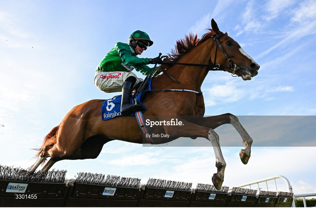 29 November 2025; Talk The Talk, with Sam Ewing up, jumps the last on their way to winning the Jack McInerney Memorial Hurdle during day one of the Fairyhouse Winter Festival at Fairyhouse Racecourse in Meath. Photo by Seb Daly/Sportsfile
