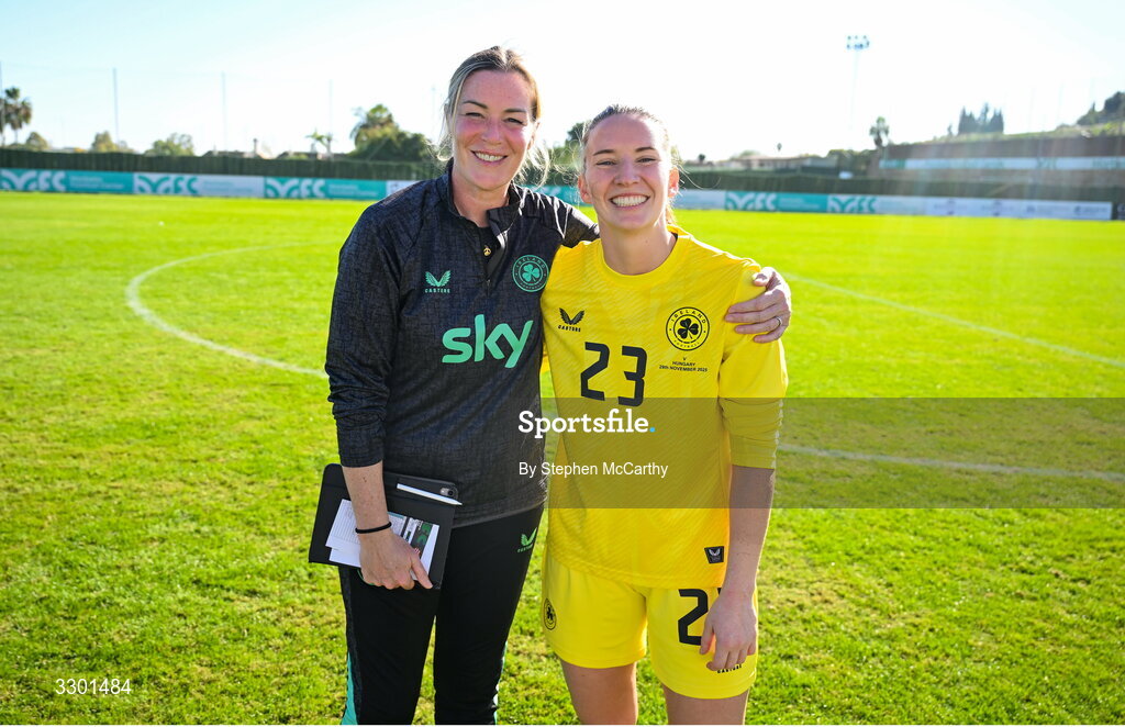 29 November 2025; Republic of Ireland goalkeeper Sophie Whitehouse with goalkeeping coach Emma Byrne after the women's international friendly match between Republic of Ireland and Hungary at Marbella Football Centre in Marbella, Spain. Photo by Stephen McCarthy/Sportsfile