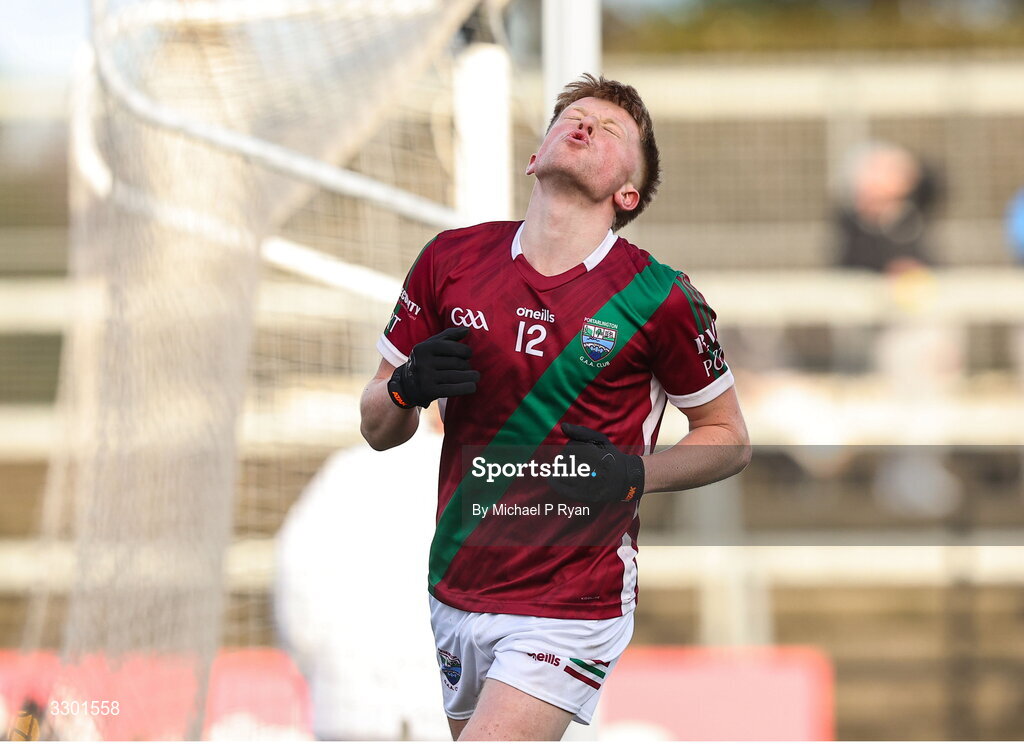 29 November 2025; Rioghan Murphy of Portarlington reacts to a missed opportunity on goal during the AIB Leinster GAA Football Senior Club Championship semi-final match between Athy and Portarlington at Cedral St Conleth's Park in Newbridge, Kildare. Photo by Michael P Ryan/Sportsfile