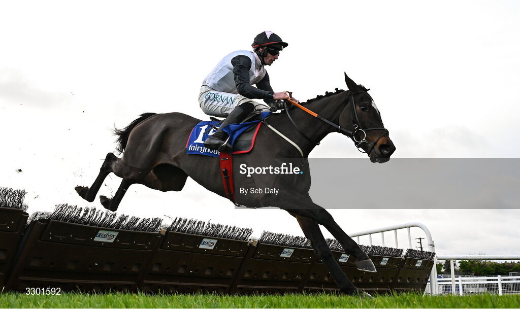29 November 2025; Skylight Hustle, with Jack Kennedy up, jumps the last on their way to winning the Kettles Country House Hotel Maiden Hurdle during day one of the Fairyhouse Winter Festival at Fairyhouse Racecourse in Meath. Photo by Seb Daly/Sportsfile