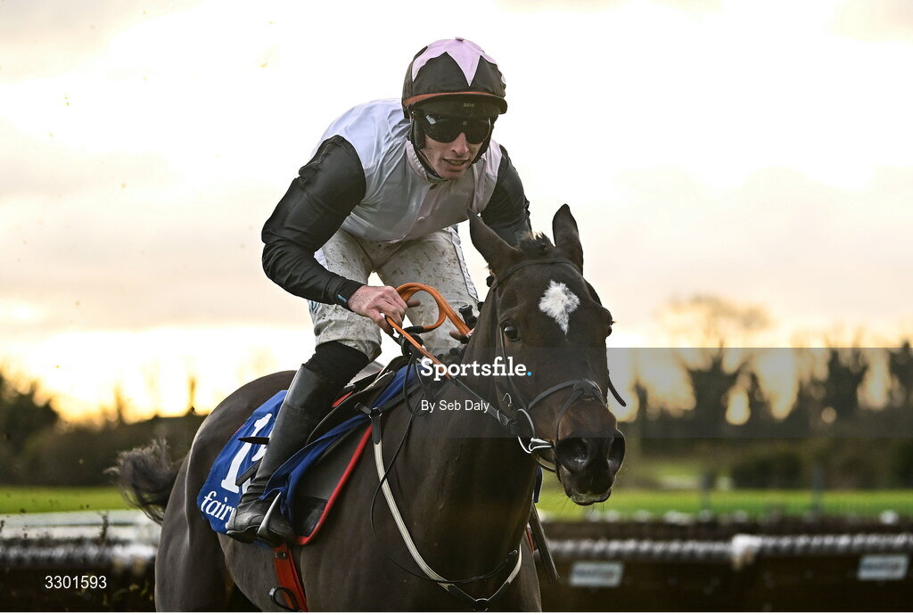 29 November 2025; Skylight Hustle, with Jack Kennedy up, on their way to winning the Kettles Country House Hotel Maiden Hurdle during day one of the Fairyhouse Winter Festival at Fairyhouse Racecourse in Meath. Photo by Seb Daly/Sportsfile