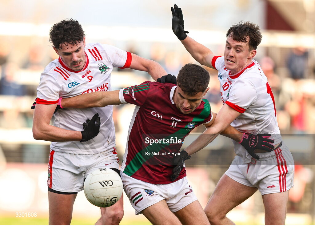 29 November 2025; Ronan Coffey of Portarlington in action against Athy players, from left, David Hyland and Brian Maher during the AIB Leinster GAA Football Senior Club Championship semi-final match between Athy and Portarlington at Cedral St Conleth's Park in Newbridge, Kildare. Photo by Michael P Ryan/Sportsfile