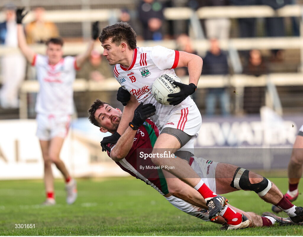 29 November 2025; Mark Hyland of Athy in action against Keith Bracken of Portarlington during the AIB Leinster GAA Football Senior Club Championship semi-final match between Athy and Portarlington at Cedral St Conleth's Park in Newbridge, Kildare. Photo by Michael P Ryan/Sportsfile
