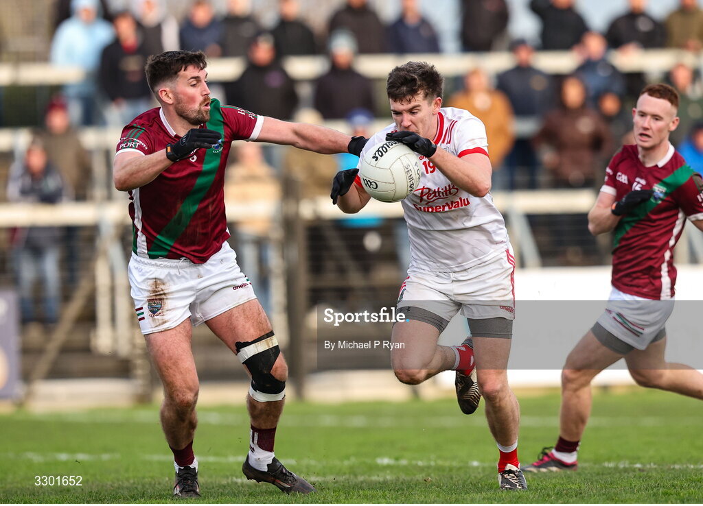 29 November 2025; Mark Hyland of Athy in action against Keith Bracken of Portarlington during the AIB Leinster GAA Football Senior Club Championship semi-final match between Athy and Portarlington at Cedral St Conleth's Park in Newbridge, Kildare. Photo by Michael P Ryan/Sportsfile