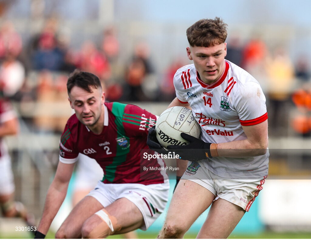 29 November 2025; Colm Moran of Athy in action against Mikey Bennett of Portarlington during the AIB Leinster GAA Football Senior Club Championship semi-final match between Athy and Portarlington at Cedral St Conleth's Park in Newbridge, Kildare. Photo by Michael P Ryan/Sportsfile