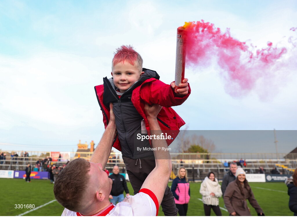 29 November 2025; Barry Kelly of Athy celebrates with his cousin Freddie Salmon, age 3, after the AIB Leinster GAA Football Senior Club Championship semi-final match between Athy and Portarlington at Cedral St Conleth's Park in Newbridge, Kildare. Photo by Michael P Ryan/Sportsfile