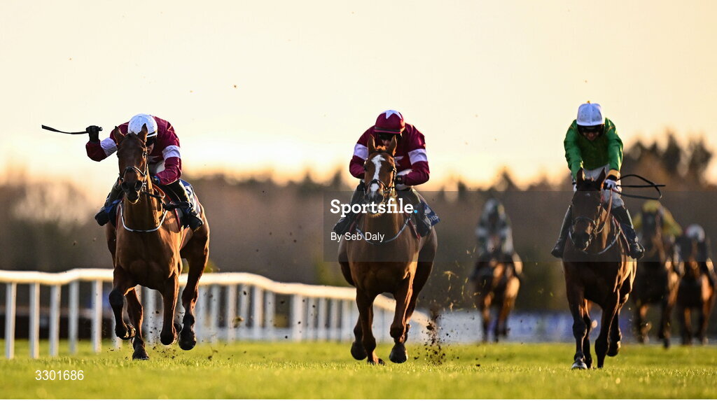 29 November 2025; Keep Him Company, left, with Joshua Williamson up, on their way to winning the Willie Elliott Memorial Pro/Am Flat Race during day one of the Fairyhouse Winter Festival at Fairyhouse Racecourse in Meath. Photo by Seb Daly/Sportsfile
