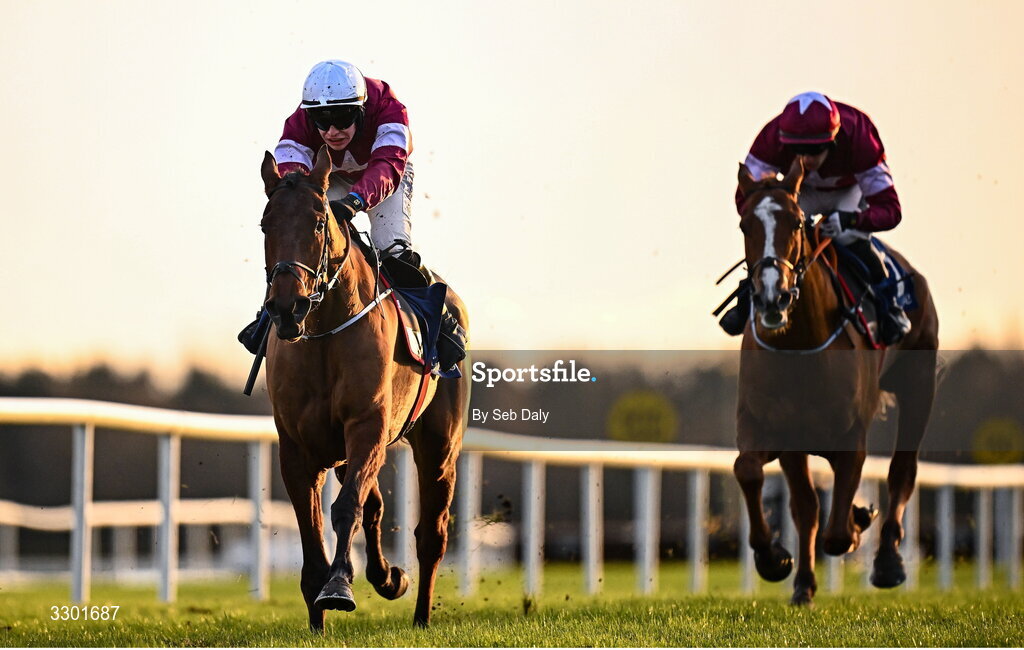 29 November 2025; Keep Him Company, left, with Joshua Williamson up, on their way to winning the Willie Elliott Memorial Pro/Am Flat Race during day one of the Fairyhouse Winter Festival at Fairyhouse Racecourse in Meath. Photo by Seb Daly/Sportsfile