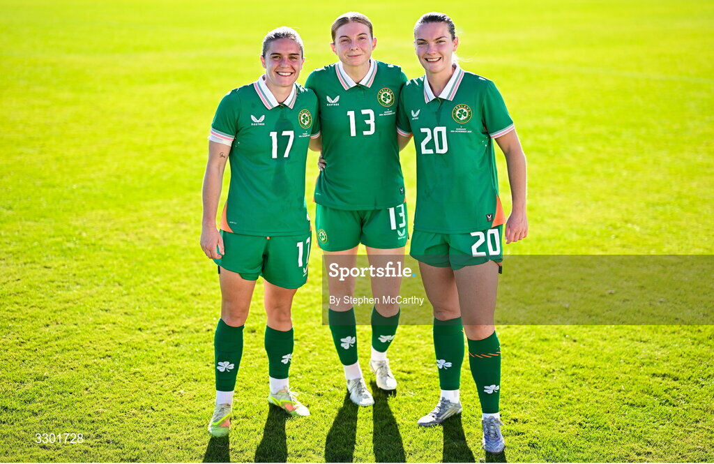 29 November 2025; Republic of Ireland players, from left, Jamie Finn, Hayley Nolan and Saoirse Noonan after the women's international friendly match between Republic of Ireland and Hungary at Marbella Football Centre in Marbella, Spain. Photo by Stephen McCarthy/Sportsfile