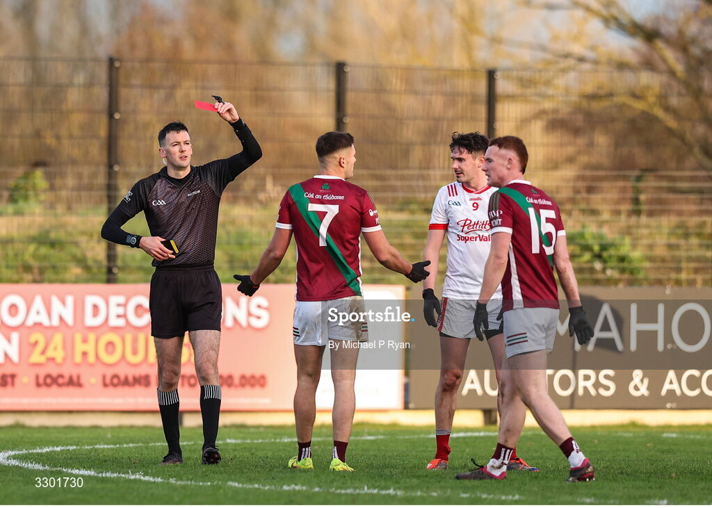 29 November 2025; Patrick O'Sullivan of Portarlington, 7, is shown a red card by referee Andrew Smith during the AIB Leinster GAA Football Senior Club Championship semi-final match between Athy and Portarlington at Cedral St Conleth's Park in Newbridge, Kildare. Photo by Michael P Ryan/Sportsfile