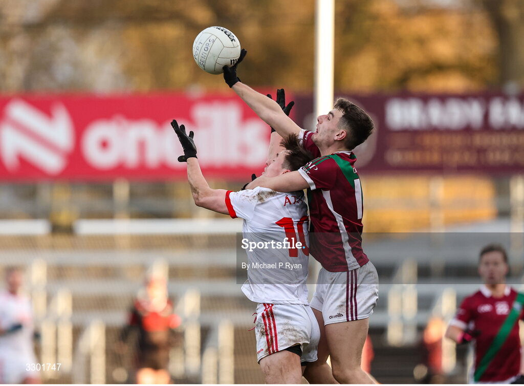 29 November 2025; Brian Maher of Athy in action against Darragh Slevin of Portarlington during the AIB Leinster GAA Football Senior Club Championship semi-final match between Athy and Portarlington at Cedral St Conleth's Park in Newbridge, Kildare. Photo by Michael P Ryan/Sportsfile