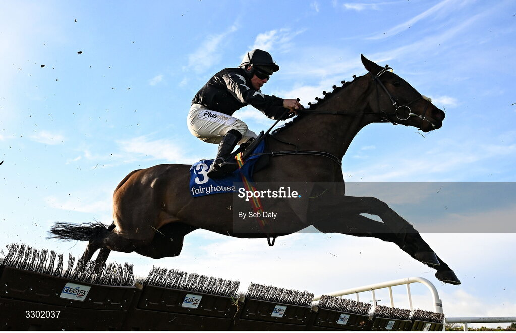 29 November 2025; I'm Slippy, with Phillip Enright up, during the Jack McInerney Memorial Hurdle on day one of the Fairyhouse Winter Festival at Fairyhouse Racecourse in Meath. Photo by Seb Daly/Sportsfile