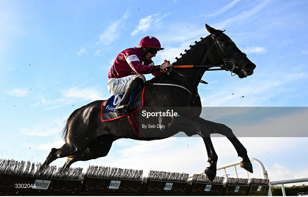 29 November 2025; Wendrock, with Jack Kennedy up, during the Jack McInerney Memorial Hurdle on day one of the Fairyhouse Winter Festival at Fairyhouse Racecourse in Meath. Photo by Seb Daly/Sportsfile