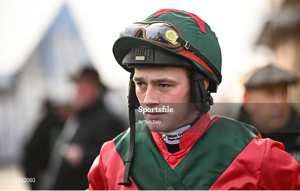 29 November 2025; Jockey Cian Micheal Quirke before the Race And Stay Irish EBF Mares Handicap Steeplechase during day one of the Fairyhouse Winter Festival at Fairyhouse Racecourse in Meath. Photo by Seb Daly/Sportsfile