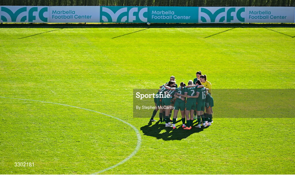 29 November 2025; Republic of Ireland players huddle before the second-half of the women's international friendly match between Republic of Ireland and Hungary at Marbella Football Centre in Marbella, Spain. Photo by Stephen McCarthy/Sportsfile