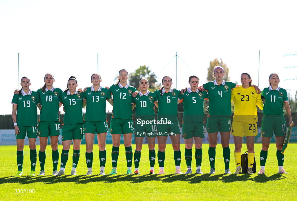 29 November 2025; Republic of Ireland players, from left, Abbie Larkin, Kyra Carusa, Lucy Quinn, Hayley Nolan, Anna Patten, Denise O’Sullivan, Tyler Toland, Aoife Mannion, Caitlin Hayes, goalkeeper Sophie Whitehouse and Katie McCabe stand for the playing of the National Anthem during the women's international friendly match between Republic of Ireland and Hungary at Marbella Football Centre in Marbella, Spain. Photo by Stephen McCarthy/Sportsfile