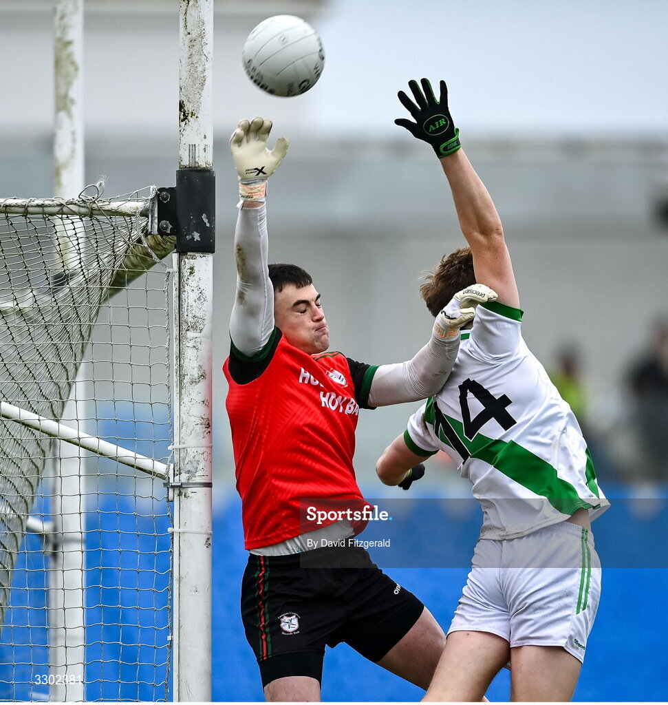 30 November 2025; St Brigid’s goalkeeper Conor Carroll in action against Fiachra McDonagh of Maigh Cuilinn during the AIB Connacht GAA Football Senior Club Championship final match between St Brigid's and Maigh Cuilinn at King & Moffatt Dr Hyde Park in Roscommon. Photo by David Fitzgerald/Sportsfile