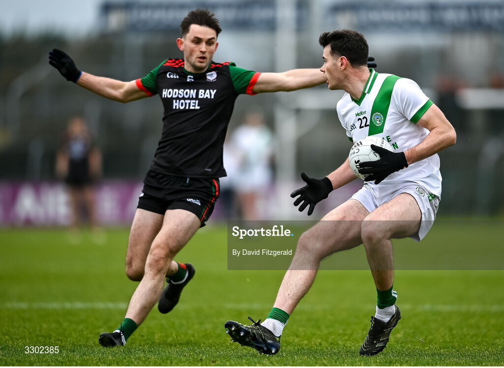 30 November 2025; Gearard Davoren of Maigh Cuilinn in action against Brian Stack of St Brigid’s during the AIB Connacht GAA Football Senior Club Championship final match between St Brigid's and Maigh Cuilinn at King & Moffatt Dr Hyde Park in Roscommon. Photo by David Fitzgerald/Sportsfile