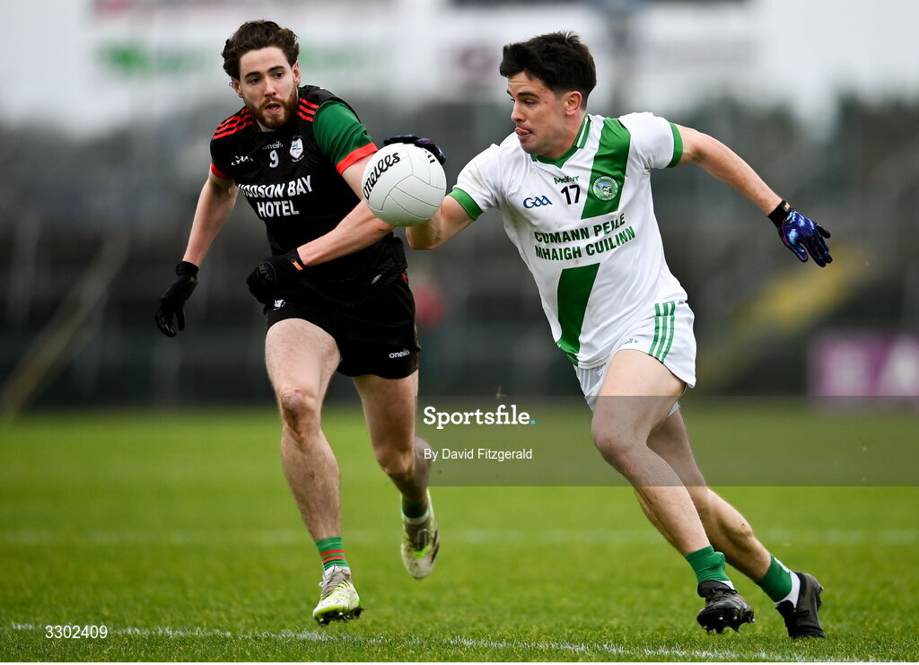 30 November 2025; Seán Kelly of Maigh Cuilinn in action against Eddie Nolan of St Brigid’s during the AIB Connacht GAA Football Senior Club Championship final match between St Brigid's and Maigh Cuilinn at King & Moffatt Dr Hyde Park in Roscommon. Photo by David Fitzgerald/Sportsfile