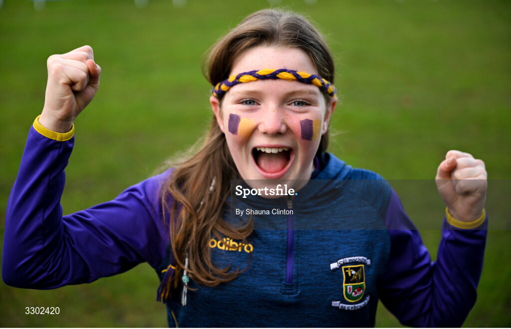 30 November 2025; Kilmacud Crokes supporter Katie Hickey, aged 11, from Stillorgan in Dublin, before the 2025 AIB All-Ireland Ladies Football Club Senior Club Championship semi-final match between Kilmacud Crokes of Dublin and St Ergnat’s of Antrim at Páirc de Burca in Stillorgan, Dublin. Photo by Shauna Clinton/Sportsfile