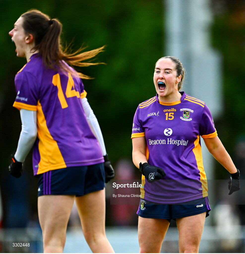30 November 2025; Éabha Rutledge of Kilmacud Crokes, right, and team-mate Michelle Davoren celebrate a score during the 2025 AIB All-Ireland Ladies Football Club Senior Club Championship semi-final match between Kilmacud Crokes of Dublin and St Ergnat’s of Antrim at Páirc de Burca in Stillorgan, Dublin. Photo by Shauna Clinton/Sportsfile