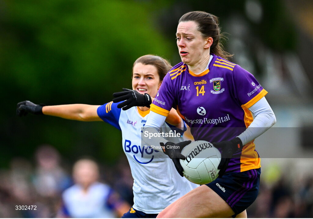 30 November 2025; Michelle Davoren of Kilmacud Crokes in action against Niamh McIntosh of St Ergnat's, Moneyglass during the 2025 AIB All-Ireland Ladies Football Club Senior Club Championship semi-final match between Kilmacud Crokes of Dublin and St Ergnat’s of Antrim at Páirc de Burca in Stillorgan, Dublin. Photo by Shauna Clinton/Sportsfile
