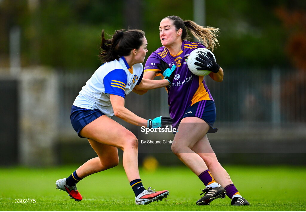 30 November 2025; Éabha Rutledge of Kilmacud Crokes in action against Rebecca Bradley of St Ergnat's, Moneyglass during the 2025 AIB All-Ireland Ladies Football Club Senior Club Championship semi-final match between Kilmacud Crokes of Dublin and St Ergnat’s of Antrim at Páirc de Burca in Stillorgan, Dublin. Photo by Shauna Clinton/Sportsfile