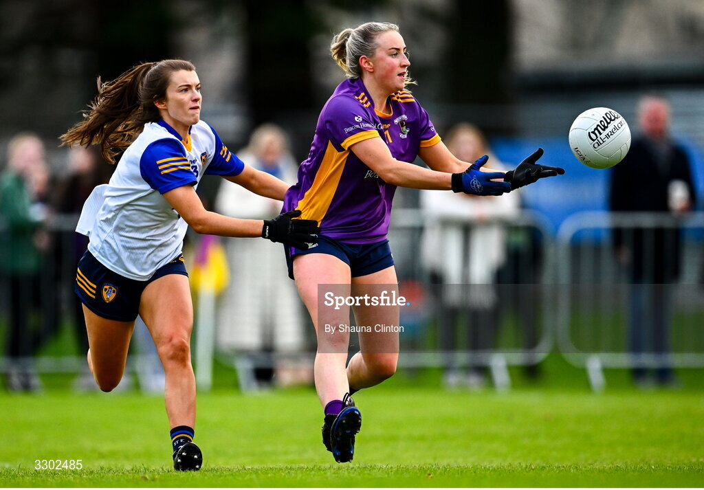 30 November 2025; Ailbhe Davoren of Kilmacud Crokes is tackled by Niamh McIntosh of St Ergnat's, Moneyglass during the 2025 AIB All-Ireland Ladies Football Club Senior Club Championship semi-final match between Kilmacud Crokes of Dublin and St Ergnat’s of Antrim at Páirc de Burca in Stillorgan, Dublin. Photo by Shauna Clinton/Sportsfile