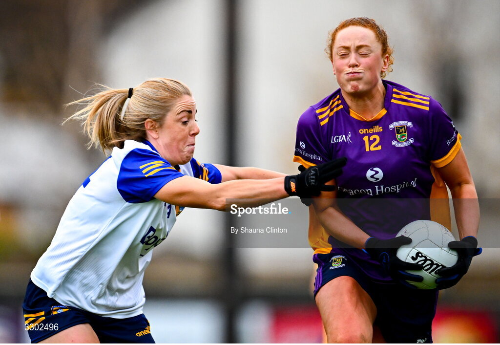 30 November 2025; Niamh Cotter of Kilmacud Crokes is tackled by Cathy Carey of St Ergnat's, Moneyglass during the 2025 AIB All-Ireland Ladies Football Club Senior Club Championship semi-final match between Kilmacud Crokes of Dublin and St Ergnat’s of Antrim at Páirc de Burca in Stillorgan, Dublin. Photo by Shauna Clinton/Sportsfile