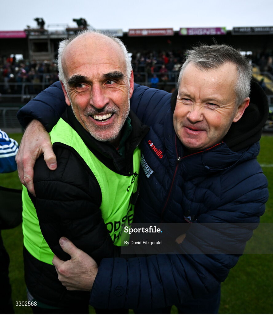 30 November 2025; St Brigid’s manager Anthony Cunningham, left, celebrates with Kenny Noonan at the final whistle after the AIB Connacht GAA Football Senior Club Championship final match between St Brigid's and Maigh Cuilinn at King & Moffatt Dr Hyde Park in Roscommon. Photo by David Fitzgerald/Sportsfile