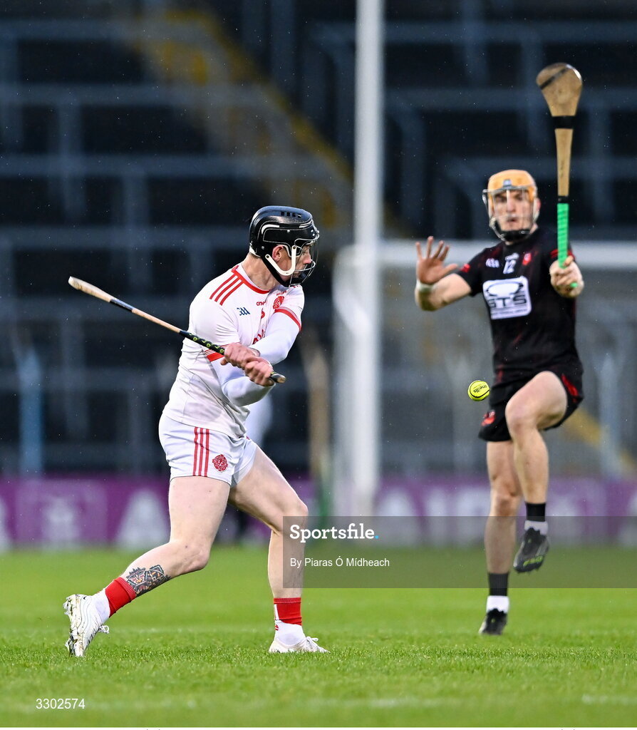 30 November 2025; Aaron Fitzgerald of Éire Óg Ennis clears the ball as Peter Hogan of Ballygunner closes in during the AIB Munster GAA Hurling Senior Club Championship final match between Ballygunner and Éire Óg Ennis at FBD Semple Stadium in Thurles, Tipperary. Photo by Piaras Ó Mídheach/Sportsfile