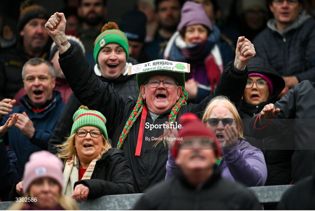 30 November 2025; St Brigid's supporters celebrate their side's first goal during the AIB Connacht GAA Football Senior Club Championship final match between St Brigid's and Maigh Cuilinn at King & Moffatt Dr Hyde Park in Roscommon. Photo by David Fitzgerald/Sportsfile
