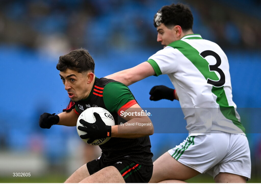 30 November 2025; Brian Derwin of St Brigid’s in action against Michael Moughan of Maigh Cuilinn during the AIB Connacht GAA Football Senior Club Championship final match between St Brigid's and Maigh Cuilinn at King & Moffatt Dr Hyde Park in Roscommon. Photo by David Fitzgerald/Sportsfile