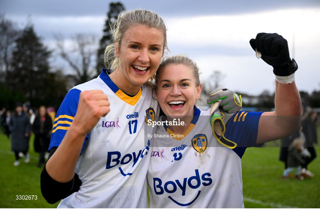 30 November 2025; St Ergnat's, Moneyglass players Laura McCann, left, and Eleanor Mallon celebrate after their side's victory in the 2025 AIB All-Ireland Ladies Football Club Senior Club Championship semi-final match between Kilmacud Crokes of Dublin and St Ergnat’s of Antrim at Páirc de Burca in Stillorgan, Dublin. Photo by Shauna Clinton/Sportsfile