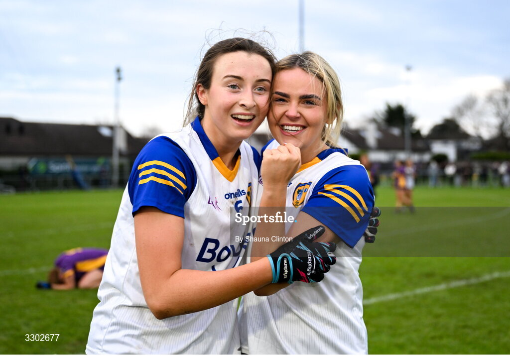 30 November 2025; St Ergnat's, Moneyglass players Sarah O'Neill, left, and Aoife Kelly celebrate after their side's victory in the 2025 AIB All-Ireland Ladies Football Club Senior Club Championship semi-final match between Kilmacud Crokes of Dublin and St Ergnat’s of Antrim at Páirc de Burca in Stillorgan, Dublin. Photo by Shauna Clinton/Sportsfile