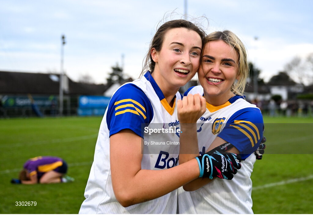 30 November 2025; St Ergnat's, Moneyglass players Sarah O'Neill, left, and Aoife Kelly celebrate after their side's victory in the 2025 AIB All-Ireland Ladies Football Club Senior Club Championship semi-final match between Kilmacud Crokes of Dublin and St Ergnat’s of Antrim at Páirc de Burca in Stillorgan, Dublin. Photo by Shauna Clinton/Sportsfile