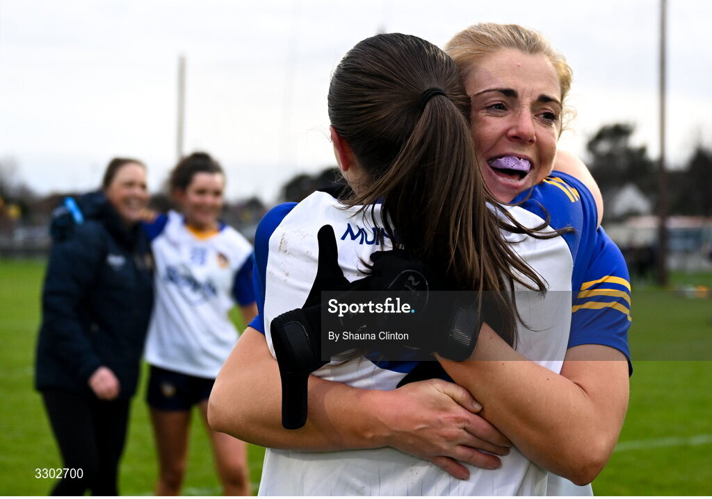 30 November 2025; St Ergnat's, Moneyglass players Cathy Carey, left, and celebrate after their side's victory in the 2025 AIB All-Ireland Ladies Football Club Senior Club Championship semi-final match between Kilmacud Crokes of Dublin and St Ergnat’s of Antrim at Páirc de Burca in Stillorgan, Dublin. Photo by Shauna Clinton/Sportsfile