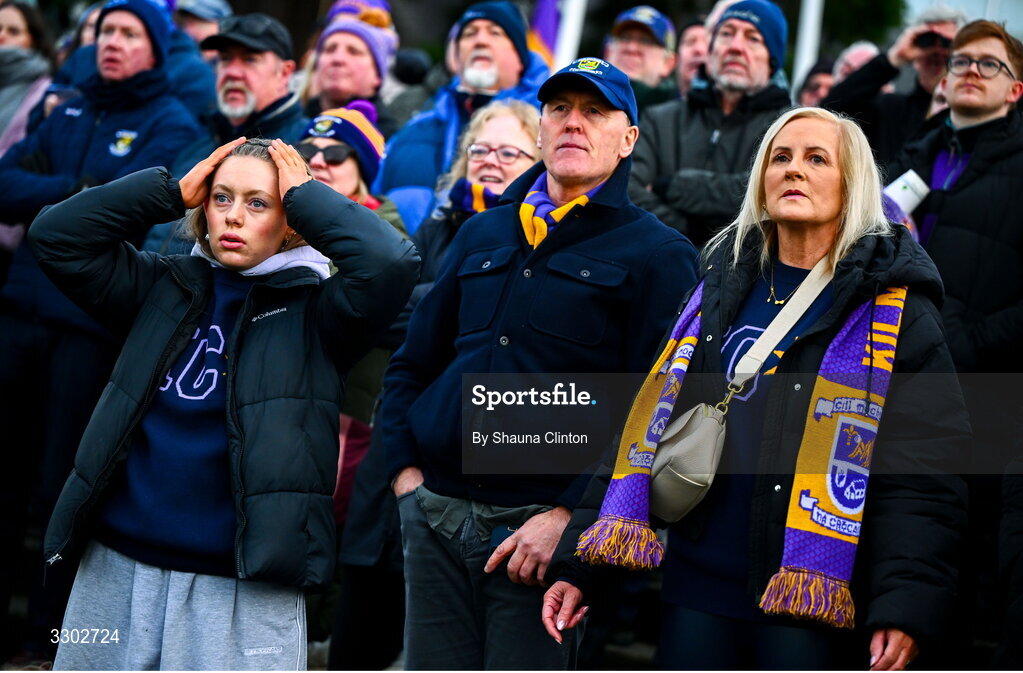 30 November 2025; Kilmacud Crokes supporters react during the 2025 AIB All-Ireland Ladies Football Club Senior Club Championship semi-final match between Kilmacud Crokes of Dublin and St Ergnat’s of Antrim at Páirc de Burca in Stillorgan, Dublin. Photo by Shauna Clinton/Sportsfile
