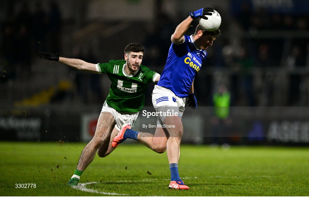 30 November 2025; Darren Hughes of Scotstown is tackled by Shane McGrogan of Newbridge during the AIB Ulster GAA Football Senior Club Championship semi-final match between Scotstown and Newbridge at BOX-IT Athletic Grounds in Armagh. Photo by Ben McShane/Sportsfile