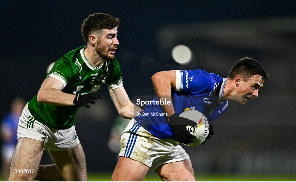 30 November 2025; Shane Carey of Scotstown is tackled by Shane McGrogan of Newbridge during the AIB Ulster GAA Football Senior Club Championship semi-final match between Scotstown and Newbridge at BOX-IT Athletic Grounds in Armagh. Photo by Ben McShane/Sportsfile