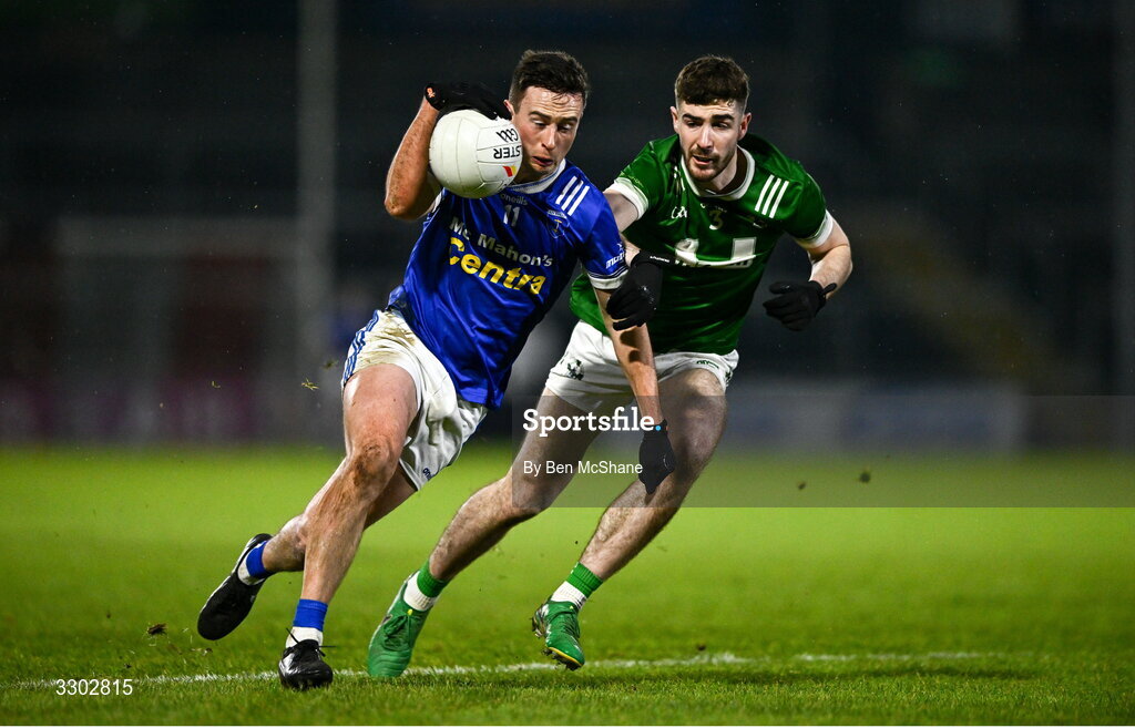 30 November 2025; Shane Carey of Scotstown is tackled by Shane McGrogan of Newbridge during the AIB Ulster GAA Football Senior Club Championship semi-final match between Scotstown and Newbridge at BOX-IT Athletic Grounds in Armagh. Photo by Ben McShane/Sportsfile
